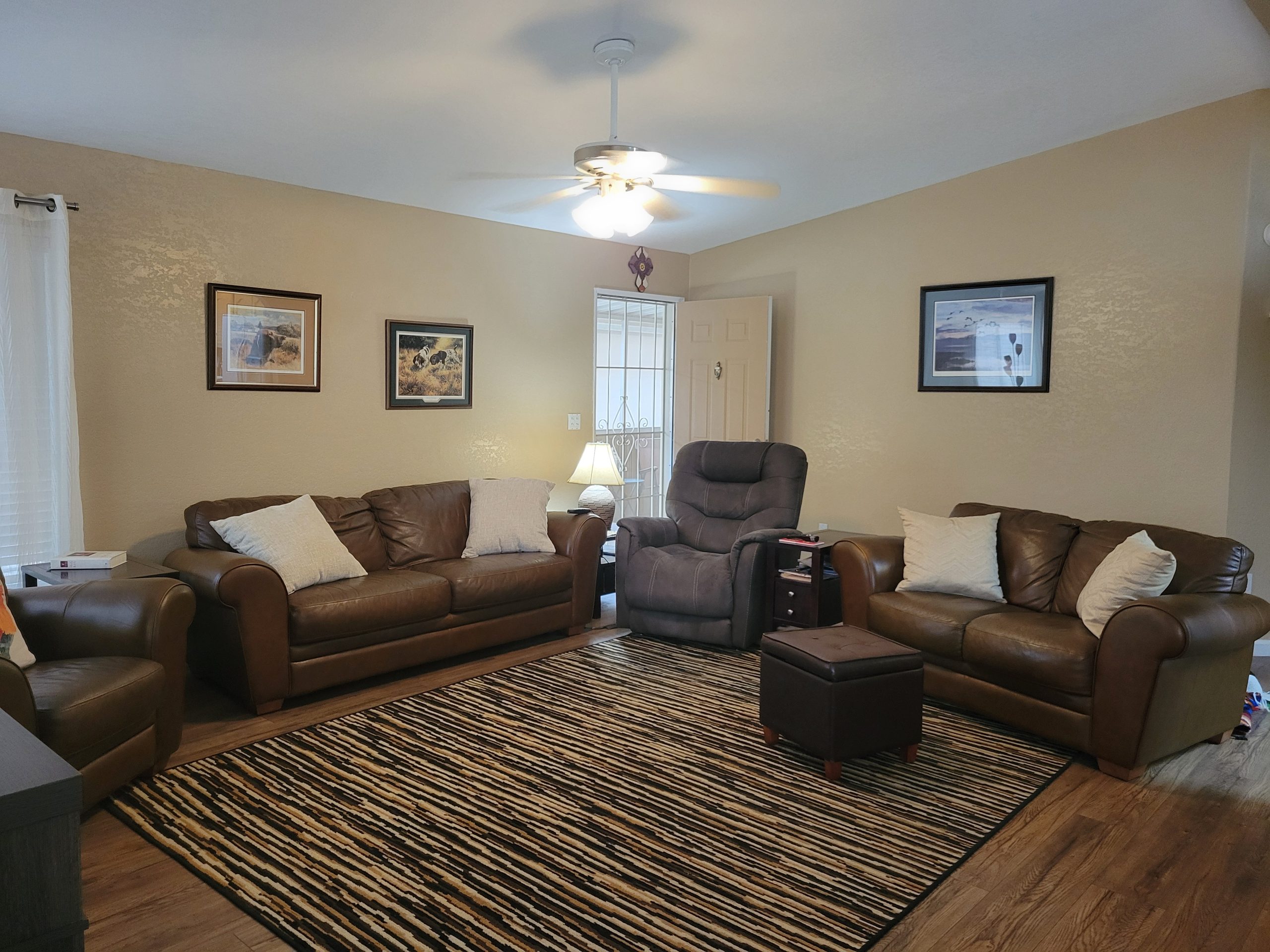 - Tres ceiling in the living room with a new ceiling fan