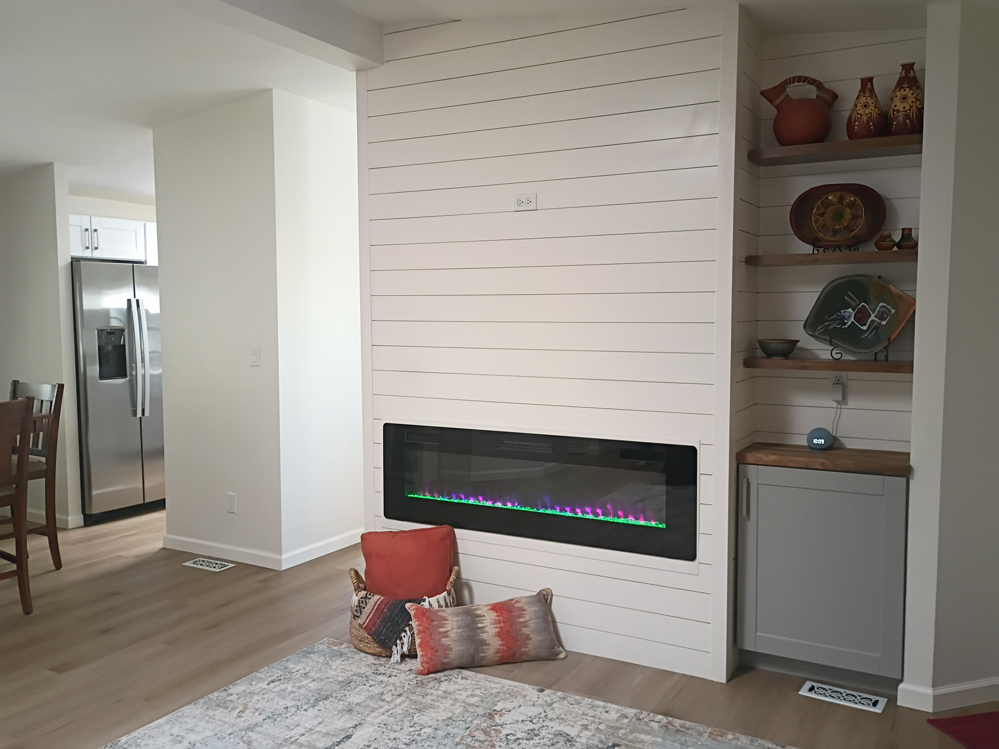 - Living room with fireplace & built-in shelving
